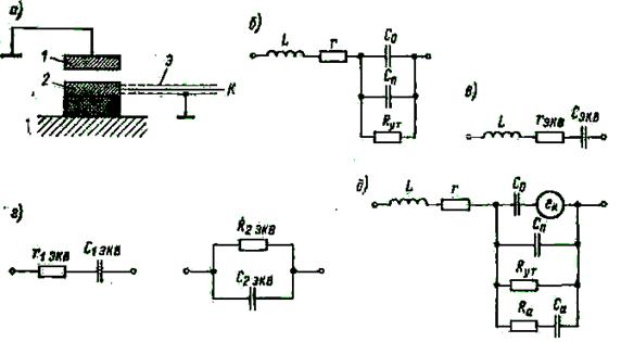Эквивалентная схема ЭС преобразователя, схематическая конструкция которого показана на рис. 2-24, а, приведена на рис. 2-24, б. В эквивалентной схеме учитываются емкость С 0 между электродами 1 и 2, сопротивление R ут изоляции между электродами, сопротивление r и индуктивность L кабеля К и его заземленным экраном Э.