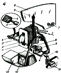 К вспомогательным деталям ИМ относятся токоподводы к рамке, противовесы, пружинящие стрелочные упоры, корректор. Токоподводами обычно служат пружины или растяжки, поэтому хотя бы одна из них должна быть изолирована от корпуса. Противовесы 8 в виде стержней с гайками предназначены для уравновешивания подвижной части, т.е. для перемещения ее центра тяжести на ось вращения, так как в противном случае возникает дополнительный момент, вызывающий погрешность механизма. Пружинящие упоры служат для ограничения перемещений подвижной части при ее отклонении за пределы шкалы. Корректор, предназначенный для установки подвижной части в нулевое положение, состоит из поводка 10, к которому прикреплен внешний конец пружины 9, и винта 11 с эксцентрично расположенным пальцем, который входит в прорезь поводка. Как видно из рассмотрения конструкций ИМ содержит следующие основные узлы: устройство, создающее вращающий момент, зависящий от электрической величины; устройство, создающее противодействующий момент, зависящий от угла отклонения; отсчетное устройство, успокоитель и ряд вспомогательных деталей.