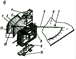 В ЭД, ФД и МЭ измерительных механизмах элементом подвижной части, участвующим в создании вращающего момента М вр, является рамка 2 (рис. 2-36, б, в, г), намотанная тонким проводом. На осях 3 укреплены подвижные части ЭМ, ЭД и ФД механизмов. Ось 3 снабжена на концах кернами и может поворачиваться в подпятниках 4. Подвижная часть МЭ измерительного механизма (рис. 2-36, г) укреплена на двух растяжках 8 (на рис. 2-36, г показана оборванная растяжка). С подвижной частью жестко связана стрелка 5, которая при повороте подвижной части перемещается над неподвижно укрепленной шкалой 6. На шкале установлены упоры 7, чтобы уберечь стрелку и подвижную часть от повреждений.