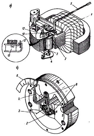 Устройство электромеханического прибора и назначение отдельных конструктивных элементов рассмотрим на примере амперметра с электромагнитным ИМ, схематически показанным на рис. 2-36, а. Основным элементом неподвижной части электромагнитного ИМ, участвующим в создании вращающего момента, является катушка 1, а основным элементом подвижной части – сердечник 2 из ферромагнитного материала, закрепленный на оси 3.