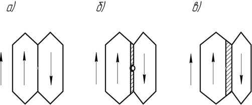 Неоднородность структуры ферромагнитного образца обусловлена немагнитными включениями или локальными механическими включениями и вызывает скачки намагниченности при изменении внешнего магнитного поля или наличии механических воздействий. Схематическое изображение доменных границ и некоторого включения показано на рис. 2-38, а. Граница между двумя доменами с противоположным направлением векторов намагниченности под воздействием внешнего магнитного поля сначала обратимо изменяет свое положение (рис. 2-38, б), а затем скачком переходит в новое положение (рис. 2-38, в). Заштрихованная часть представляет собой область, скачком изменившую свою намагниченность.