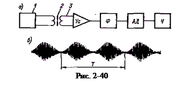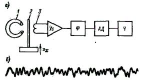 Принцип действия преобразователя с пространственным перемагничиванием ферро-магнетика показанна рис. 2-39, а. Мимо постоянного магнита 1 движетсясо скоростью vx ферромагнитный образец 2. Участок образца, находящийся вблизи магнита, намагничен, и границы этого участка смещаются со скоростью vx. В проходной, или накладной, измерительной катушке 3, установленной неподвижно, индуктируются импульсы ЭДС, вызываемые скачками Баркгаузена. Индуктируемая ЭДС представляет собой стационарный случайный процесс (рис. 2-39, б). В качестве информативных параметров этого процесса используются средняя частота выбросов, превышающих заданный уровень, или дисперсия, которые зависят от скорости перемагничивания, т.е. от скорости движения образца. Сигнал измерительной обмотки 3 (рис. 2-39, а) усиливается и подается на полосовый фильтр Ф, подавляющий низкочастотную и высокочастотную части спектра для выделения полезного сигнала. Амплитудный дискриминатор АД выделяет импульсы, амплитуда которых превышает заданный уровень, и сигнал поступает на частотомер Ч, показания которого пропорциональны скорости.