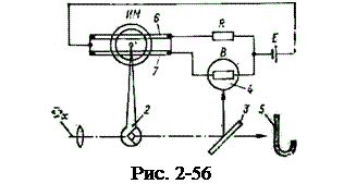 В качестве примера преобразователя, измеряющего непосредственно поток Ф х, на рис. 2-56 показано схематическое устройство автоматического экспонометра для кинокамеры. Световой поток Ф х, проходя объектив 1 и диафрагму 2 и отражаясь от зеркального обтюратора 3, попадает на фоторезистор В в отрезок времени, когда не происходит экспонирования пленки 5. Исполнительным механизмом служит измерительный механизм ИМ логометра, обмотка 6 подключена к источнику питания через резистор R, а обмотка 7 – через фоторезистор В. Обмотки 6 и 7 создают встречные вращающие моменты, поворачивающие рамку, соединенную с диафрагмой 2. Движение диафрагмы 2 происходит до тех пор, пока сопротивление фоторезистора не станет равным сопротивлению резистора R, которое используется для установки параметров экспозиции. В качестве фотоприемника применяются сернисто-кадмиевые, селенидно-кадмиевые и сульфидно-кадмиевые фоторезисторы, отличающиеся высокой чувствительностью, малыми габаритами и дешевизной.