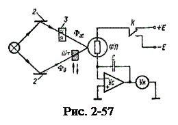 этого недостатка, в оптоэлектрических преобразователях используются структуры с одним фотоприемником и временным разделением поступающих на него потоков. Измерительная схема подобного преобразования показана на рис. 2-57. Пучок света источника 1 при помощи зеркал 2 разделяется на два потока Ф0 и Ф х. Интенсивность потока Ф х зависит от измеряемой величины (например, прозрачности объекта 3). С помощью модулятора осуществля-ется периодическое освещение фоторезистора ФП измеряемым Ф х и опорным Ф0 потоками. Синхронно с движением шторки ШТ переключается ключ К, с помощью которого на вход интегратора (ФП, конденсатор С, усилитель Ус) через фоторезистор ФП подается ток от положительного и отрицательного полюсов источника напряжения Е. При этом ток, пропорциональный измеряемому потоку, заряжает конденсатор С, а ток, пропорциональный опорному потоку, – разряжает его. В конце второго такта модуляции на выходе интегратора устанавливается напряжение U, которое измеряется указателем Ук. Напряжение