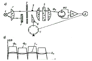 На рис. 2-58, а показано схема-тическое устройство прибора бескон-тактного контроля диаметра прово-локи. Световой поток, создаваемый источником 1, делится диафрагмой 2 с двумя отверстиями на два луча. Верхний луч частично перекрывается проволокой 3, нижний луч проходит через оптический клин 6. Матовая пластинка 4 рассеивает свет, чтобы облучение фотоприемника ФП было равномерным. Заслонка 7 колеблется между сдвинутыми отверстиями диафрагмы, модулируя световой поток на входе ФП. Если интенсивности верхнего и нижнего лучей не равны (рис. 2-58, б), на выходе ФП появляется переменная составляющая напряжения, управляющая двигателем Д. Двигатель перемещает клин 6 до уравнивания интенсивностей лучей. Выходной величиной прибора служит угол поворота двигателя, отсчитываемый по шкале 5.