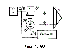 Схемы измерения фазового сдвига на частотах оптического диапазона. На рис. 2-59 приведена схема светодальномера, который состоит из генератора Г1 гармонических колебаний, полупроводникового лазера Г, фотоприемника ФП и фазометра. Излучение лазера Г, модулированное по амплитуде, распространяется до уголкового отражателя УО, установленного на расстоянии Dх от дальномера. Отраженное излучение возвращается к фотоприемнику ФП. Время распространения волны до отражателя и обратно составляет t =2 Dхn/c. За это время фаза напряжения, питающего лазер, изменится на величину
