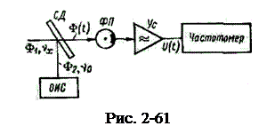Схема измерения частоты длины волны излучения оптического диапазона. На рис. 2-61 показана структурная схема преобразователя с гетеродинным преобразованием частоты. Преобразователь содержит источник опорного сигнала ИОС частоты n0, светоделитель СД, фотоприемник ФП, усилитель Ус и частотомер. На светоделитель поступают два пучка света: пучок света, частоту которого n x нужно определить, и опорный пучок. Эти пучки складываются и посылаются на фотоприемник. Световой поток, поступающий на фотоприемник, кроме постоянной составляющей Ф, содержит низкочастотную составляющую Ф(t):