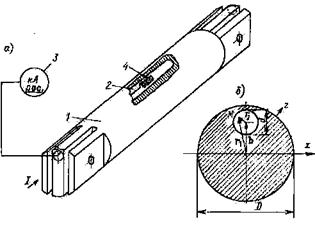 Измерение токов методом ядерного магнитного резонанса (ЯМР) основано на измерении частоты прецессии атомных ядер, в магнитном поле, создаваемом измеряемым током. Как известно, метод ЯМР является наиболее точным методом измерения магнитной индукции однородных постоянных магнитных полей, обеспечивающим измерения с погрешностью 0,001 % и менее. Для того чтобы сохранить высокую точность метода ЯМР при его использовании для измерения постоянных токов, необходимо преобразовать измеряемый ток в индукцию однородного магнитного поля с помощью устройства, параметры которого поддаются точному теоретическому расчету или могут быть точно определены экспериментально. На рис. 2-62, а показана схема цифрового килоамперметра, основанного на использовании метода ЯМР. Преобразователь измеряемого тока в пропорциональную ему индукцию однородного магнитного поля представляет собой цилиндрическую шину 1 с эксцентрически расположенным воздушным каналом 2, в центральной части которого установлен датчик ЯМР 4, включенный на вход автоматического измерительного устройства ЯМР 3 с цифровым отсчётом.