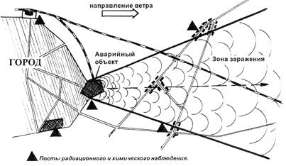 - посты радиационного и химического наблюдения должны иметь метеокомплект и выставляться не только в городе на территории объекта, но и в загородной зоне (см. рис.).