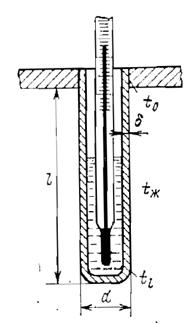 1-45. Температура воздуха в резервуаре измеряется ртутным термометром, который помещен в гильзу (стальную трубку), заполненную маслом (рис. 1-15). Термометр показывает температуру конца гильзы t l = 84 °C. Как велика ошибка измерения за счет отвода теплоты по гильзе путем теплопроводности, если температура у основания гильзы t 0 = 40 °С, длина гильзы l = 120 мм, толщина гильзы d = 1,5 мм, коэф-фициент теплопроводности мате-риала гильзы l = 55,8 Вт/(м×К) и коэффициент теплоотдачи от воздуха к гильзе a = 23,3 Вт/(м2×К).