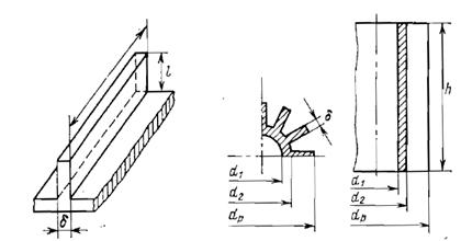 1-48. Нагревательный прибор выполнен в виде вертикальной трубы с продольными стальными ребрами прямоугольного сечения (рис. 1-17). Высота трубы h = 1200 мм; наружный диаметр трубы d 2 = 60 мм; длина ребер l = 50 мм и толщина ребер d = 3 мм, общее число ребер n = 20. Температура у основания ребра t 0 = 80 °С; температура окружающего воздуха t ж = 18 °С. Коэффициент теплоотдачи от ребер и внешней поверхности трубы к окружающему воздуху a = 9,3 Вт/(м2×K); коэффициент теплопроводности стенки l = 55,7 Вт/(м×К). Вычислить количество теплоты, отдаваемой ребристой стенкой в окружающую среду.