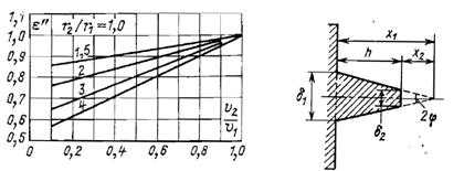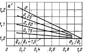 Зная отношения u2/u1 и r 2/ r 1, по графику на рис. 1-18 находим поправочный коэффициент e¢¢=0,836. Он представляет собой отношение расходов теплоты с единицы поверхности круглого и прямого ребер одинаковой толщины
