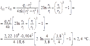 q u= ql /(p(r 22– r 12)) = 10870/(3,14(42 – 3,82))×10-6 = 2,22×109 Вт/м3.
