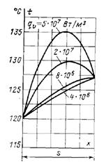 Через другую поверхность отводится q c1= q u x 0 = q u s + | q 2| = 2,4×104 + 1,2×104 Вт/м2. Распределения температур приведены на рис. 1-21.