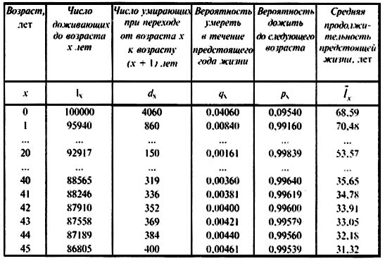 Так как рассмотренные страховые события являются массовыми, имеют вероятностный характер и связываются с возрастом застрахованных, то при установлении тарифных ставок используется теория вероятностей и таблицы смертности и средней продолжительности предстоящей жизни, которые строятся на основе переписей населения и наблюдений страхового учреждения.