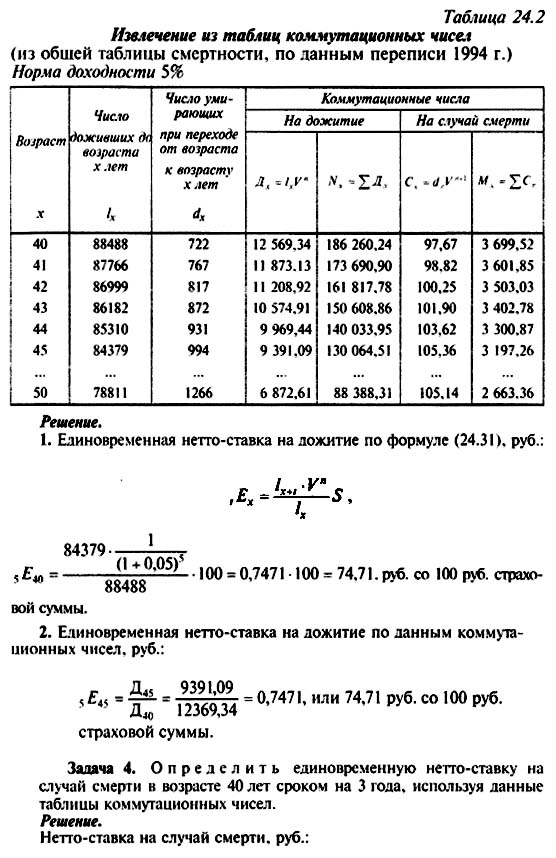Для практических расчетов этих показателей разработаны специальные таблицы коммутационных чисел, в которых содержаться взятые из таблиц смертности данные о числе до-живаюших (умирающих) для каждого возраста, начиная от нуля и кончая предельным (100 лет), дисконтном множителе для каждого возраста, а также расчетные показатели (коммутационные числа).