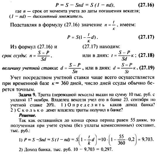 Следовательно, ставится задача, обратная определению наращения процентов: по заданной сумме 5, которую следует уплатить через некоторое время n, необходимо определить сумму полученной ссуды Р. В этих случаях говорят, что сумма S дисконтируется или учитывается. Сам процесс начисления процентов и их удержание называют учетом, а удержанные проценты (разность S - Р = Д; - дисконтом (discont).
