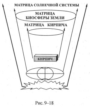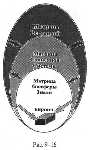 А что послужило причиной дождя и мороза, которые стали «воздействовать и изменять» «общую меру» («полную меру») кирпича? Причиной стали изменения погоды в той местности, где лежал кирпич. А в чём причина изменения погоды? Причина – изменения в биосфере всей планеты Земля. А они почему происходят? На изменения в биосфере влияет Солнце да и весь Космос. А кроме этого на погоду оказывает влияние деятельность человека. Но ведь биосфера тоже представляет собой определённую многомерную матрицу. Получается, что эта матрица объемлет («обнимает» матрицу кирпича). Однако, в свою очередь, и многомерную матрицу биосферы объемлет более многомерная матрица – в пределе это многомерная матрица всей Вселенной (рис. 9-16).