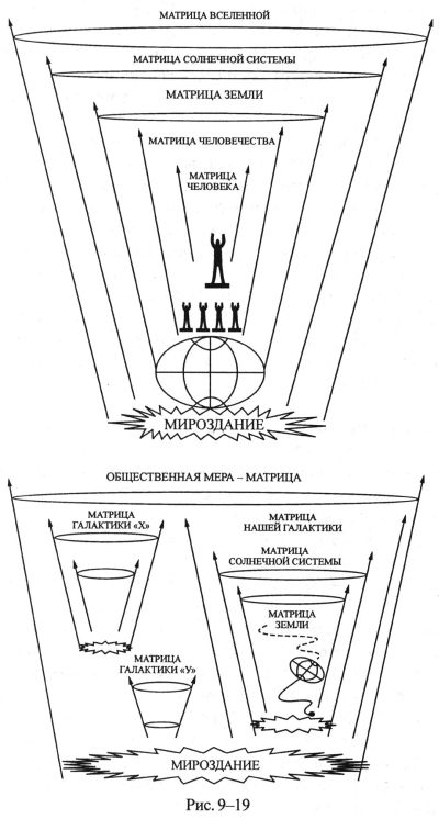 И вот все три части этой «святой троицы» – «материя – информация – мера» существуют в неразрывном единстве друг с другом: во Вселенной всякая «вещь» – МАТЕРИЯ пере-ОБРАЗ-уется в МЕРЕ предопределённым образом, т.е. по замыслу Творца. И этот процесс непрерывный. Процесс – триединство «материи – информации – меры». Все, как соседние «воронки-матрёшки», так «вложенные друг в друга» «воронки-матрёшки» и «взаимовложенные» «матрёшки воронки», все они воздействуют друг на друга за счёт колебательных процессов, о чём шла речь чуть ранее. Но все они «вложены» в одну самую-самую большую «Воронку-Матрёшку» – в «Общевселенскую Меру», которая предопределяет течение всех процессов, происходящих внутри Её расположенных меньших матрёшек. То есть «Общевселенская Мера» управляет всеми остальными «матрёшками-воронками-мерами» (рис. 9-19).