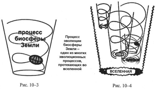 Но эволюционный процесс биосферы Земли – один из многих эволюционных процессов, протекающих во Вселенной. На рис. 10-4 рядом с «матрицей-воронкой» эволюции Земли вы видите много других «воронок-матриц», которые находятся в одной большой «воронке-матрице», которая принадлежит всей вечной и бесконечной Вселенной, и которая разворачивается-развивается по замыслу Творца, то есть Бога.