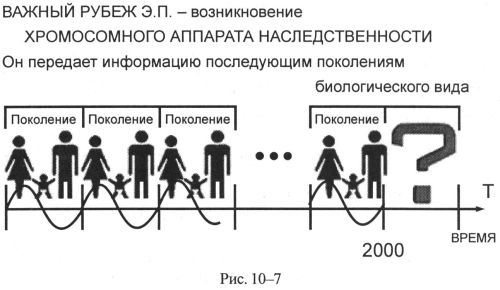 Важный рубеж эволюционного процесса биосферы – возникновение хромосомного аппарата наследственности (ХАН). Эта важность заключается в том, что ХАН передаёт информацию об «устройстве» особей биологического вида (строение организма, устройство внутренних органов и их взаимодействие, внешние характеристики особи и т.п.) последующим поколениям. Так ХАН человека (хомо сапиенс) из поколения в поколение передаёт информацию о всех его признаках и особенностях: туловище, две руки и две ноги, одна голова на которой два глаза, два уха, один нос, один рот и т.д. Человек может видеть, слышать, говорить, нюхать и т.д. Всё это хранит в себе хромосомный аппарат наследственности и передаёт всё это от поколения к поколению (см. рис. 10-7).