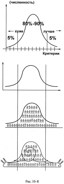 То же самое можно проделать и с любой группой людей. В качестве группы можно взять по месту проживания (деревню, город, область, страну, человечество). А можно взять людей по профилю работы (труженики села, машиностроения, военных…), можно взять по должности (начальники крупные, начальники средние, рабочие), можно взять по политическим партиям (РЕ, КПРФ, ЛДПР, КПЕ, …) и т.д. И испытывать всех людей на человеческие качества. Форма кривых при этом может быть различной (см. рис. 10-9).