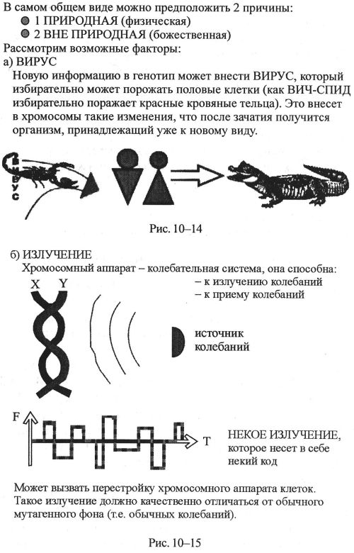 Новую информацию в генотип может внести вирус, который в состоянии избирательно поражать половые клетки (как ВИЧ-СПИД избирательно поражает красные кровяные тельца). Это внесёт в хромосомы такие изменения, в результате которых после зачатия получится организм, принадлежащий уже к новому виду. На рис. 10-14 схематично изображён процесс появления на свет уродцев, когда «на выходе» получается некий «крокодил Гена».