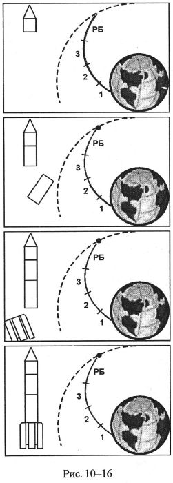 В первом случае ракета «Протон», запускаемая с космодрома Байконур, сначала поднимается вертикально вверх, затем по заложенной в неё программе «ложится на курс» и продолжает полёт уже под определённым углом к горизонту, который непрерывно изменяется. Затем по программе первая ступень «отстреливается» и включается вторая ступень, затем третья. Затем разгонный блок вместе со спутником летит по инерции до плоскости экватора и в районе надАфрикой этот разгонный блок (РБ) по программе включается и по программе же выводит спутник связи на заданную орбиту в плоскость экватора на высоту приблизительно 40 тыс. км, задав спутнику такую скорость, что он начинает вращаться вокруг Земли со скоростью, соответствующей скорости вращения Земли. В результате этого с Земли кажется, что спутник «висит» над Землей в одной точке. Это очень удобно для связи. Выставил на Земле антенну в одну точку и всё. Не надо её вращать и следить за спутником, как это было с первыми искусственными спутниками Земли.