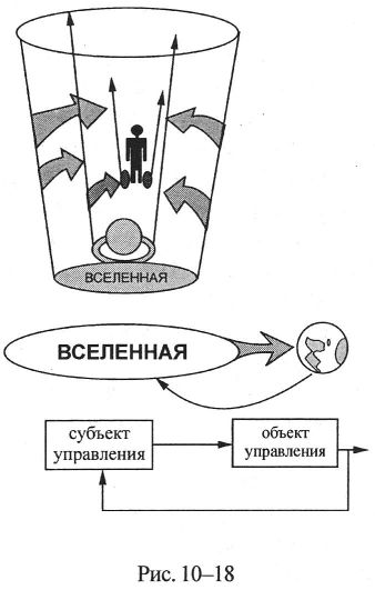 На рис. 10-18 мы видим сопоставление Вселенной и биосферы Земли в виде «субъекта управления» и «объекта управления». Можно представить картину с извозчиком и лошадью. Извозчик – субъект управления, лошадь – объект управления. Извозчик даёт голосом команды, хлещет кнутом, дёргает вожжи – всё это управляющая информация. И лошадь её выполняет. Не будет слушаться, извозчик её так хлестнёт кнутом, что не обрадуешься … Перенесите этот образ на наши воронки, вложенные одна в другую.