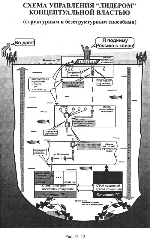 На рис. 12-12 изображена схема дистанционного управления различного рода «начальниками» («лидерами», «вождями»), которые не знают элементарных основ управления, что позволяет другим управлять ими в обход их сознания. На рис. 12-12 изображена река, по течению которой несётся щепка, на которой стоит «лидер». Он орёт на всю округу: «Я подниму Россию с колен!» На берегу стоят люди. Они видят только поверхность воды и щепку с «лидером» и восхищаются им: «Во, даёт!» Но они не видят всего того, что под поверхностью воды, там, в глубине «где раки зимуют». А под поверхностью изображена вся описанная выше схема управления. Такую картину хорошо выразил в стихах Омар Хайям: