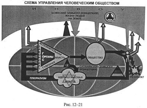 С точки зрения не образа, а смысла, предстоит перевести человечество с сатанинской несправедливой концепции управления на Божескую справедливую концепцию управления, которой на рисунке соответствует «верхний контур управления». Этот переход предполагает: