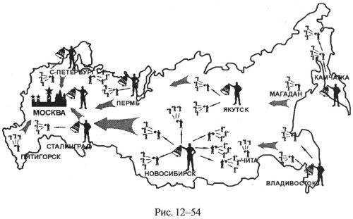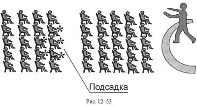 Примером выполнения этих 3-х пунктов является любой зрительный зал театра, дворца, стадиона. В зале тысяча человек. Выступает с трибуны какой-то «авторитет». Говорит откровенную глупость. Но по окончании его «речи» «подсадка» из нескольких человек начинает хлопать в определённом ритме: «Та, та, та-та-та …» И вот уже вся тысяча человек начинает в этом ритме тоже хлопать в ладоши (рис.12-53). «Хлопок в ладоши» – 1 бит информации (самая малая единица измерения информации):«1» или «О»; «да» или «нет»).