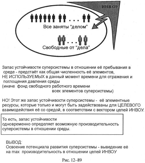 Запас устойчивости суперсистемы в отношении её пребывания в «среде» – предстаёт как общая численность её элементов, неиспользуемых в данный момент времени для отражения (отработки) давления «среды». То есть существует какая-то часть элементов суперсистемы, которая отражает «давление среды», но есть ещё и элементы суперсистемы, которые «свободны от этой работы». Иначе это можно представить как «фонд свободного от работы времени всех элементов суперсистемы» (рис.12-89).
