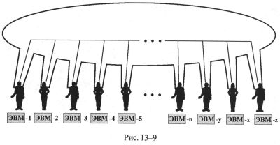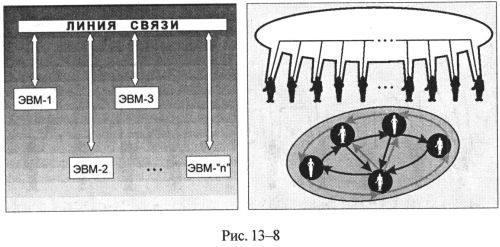 2. В информационном отношении люди порождают эгрегор подобно тому, как множество компьютеров могут образовывать сеть обработки информации, если эти компьютеры соединить каналами обмена информации (рис. 13-8).
