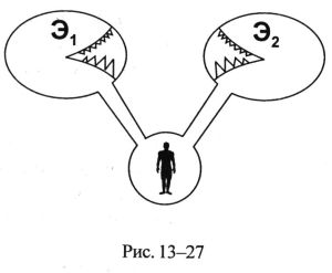 Если психика какого-то человека находится под воздействием взаимно-антагонистических эгрегоров (рис. 13-27), то такие люди сами про себя говорят: «Душа рвётся на куски».
