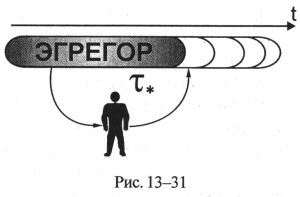 Эгрегориальное водительство может осуществляться по отношению к конкретному человеку со стороны взаимно неантагонистических эгрегоров. Как правило, время жизни таких эгрегоров может превосходить время жизни человека Водительство осуществляется по долгосрочной стратегии какого-то эгрегора и начинается ещё в период становления личности человека в детстве. То есть, проще говоря, эгрегор, обладая собственным интеллектом (который гораздо мощнее интеллекта одного человека), сам перед собой ставит какие-то задачи (формирует вектор целей). Для решения каких-то задач ему требуется участие человека. Такого человека эгрегор находит сам. И с целью достижения определённых целей он «курирует» деятельность такого человека на протяжении всей его жизни: учит, подсказывает, помогает, оберегает и т.п. (рис. 13-31).