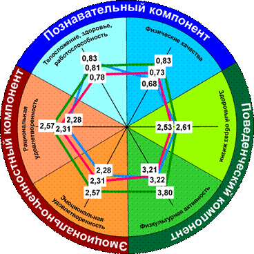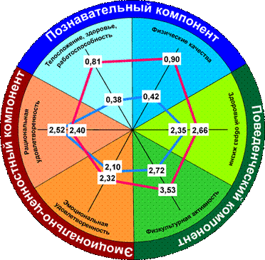 Уровень развития поведенческого компонента определялся по ответам на вопросы разработанной нами анкеты «Здоровый образ жизни и физкультурно-оздоровительная активность». Учитывались две группы показателей, характеризующих реальное поведение и деятельность, связанные с функционированием Я-физического. За показатель развития компонента принималось среднее значение показателей активности в обеих сферах деятельности: здоровье сберегающей и физкультурно-оздоровительной.