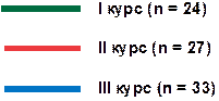 Наблюдается тенденция усиления эмоциональной удовлетворенности Я-физическим: от 2,57 балла на первом курсе до 2,28 балла на третьем курсе (Р=0,212). При этом наибольший прирост наблюдается на втором курсе – от 2,57 до 2,31 балла. Рациональная удовлетворенность Я-физическим ко второму курсу снижается от 2,39 до 2,66 балла, и незначительно усиливается на третьем курсе (до 2,47 балла).