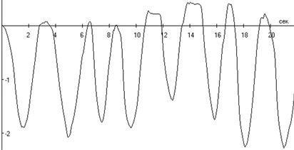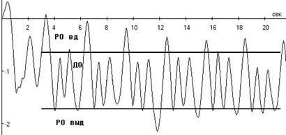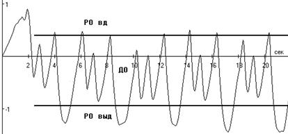 Нами были обнаружены три основных вида регуляции дыхательных объемов во время выполнения упражнений. Характерные паттерны дыхания для этих видов дыхания представлены на рисунках 1-4, где по оси ординат – объем воздуха (литры); по оси абсцисс – время (секунды). Первый вид – увеличение дыхательного объема в сторону резервного объема вдоха (РО вдоха) (Рисунок 1). Второй вид регуляции – увеличение дыхательного объема в сторону резервного объема выдоха (РО выдоха) (Рисунок 2). Третий вид регуляции – изменение ДО в каждом цикле дыхания, в котором отражается неритмичность дыхательных циклов, задержки дыхания на вдохе (Рисунок 3).