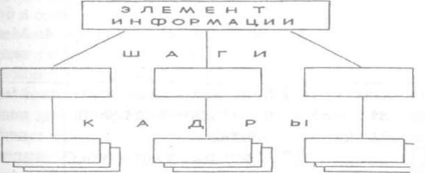 Основополагающими принципами ПО являются деление учебного материала на порции (дозы), шаги, кадры и пооперационный контроль. Основной структурной единицей ПО является элемент информации. В свою очередь каждый элемент информации делится на шаги, а каждый шаг на кадры (рис. 1).