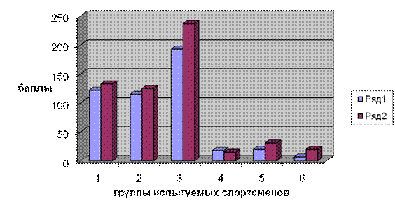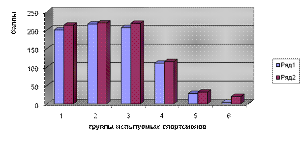 Условные обозначения: Ряд 1 – контрольные группы испытуемых спортсменов; Ряд 2 – экспериментальные группы испытуемых спортсменов; 1 - группы юных спортсменов-новичков (от 14 до 16 лет); 2 – группы студентов спортсменов-новичков (от 17 до 19 лет); 3 – группы взрослых спортсменов-новичков (от 22 до 34 лет); 4 - группы опытных спортсменов (от 14 до 19 лет); 5 – группы мастеров (от 20 до 24 лет); 6 – группы высшего мастерства (от 20 до 29 лет)