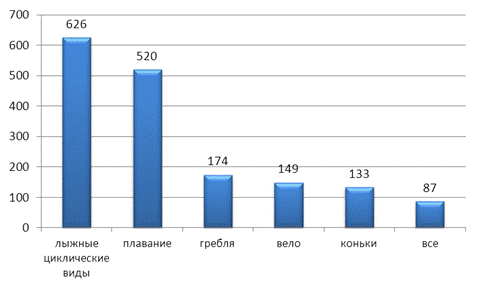 Анализ структуры опубликованных за исследуемый период статей в журнале «Теория и практика физической культуры», посвященных циклическим видам спорта, позволил выявить следующее (рис. 1). Наибольшее внимание исследователей было посвящено лыжным циклическим видам спорта (626 работ), чуть в меньшей степени – плаванию (520 работ). Существенно менее обсуждаемыми циклическими видами спорта на страницах журнала являются гребля (174 работы), велосипедный (149 работ) и конькобежный спорт (133 работы). В то же время авторы 87 публикаций рассматривали циклические виды спорта в комплексе.