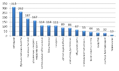 Анализ структуры публикаций по категориям обсуждаемых вопросов (рис. 2) позволяет отметить, что наиболее популярными у авторов были вопросы, связанные с методикой обучения и тренировки в различных циклических видах спорта (313 работ), а также функциональные аспекты циклических видов спорта (262).