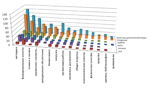 Рис. 3. Структура публикаций по циклическим видам спорта и категориям обсуждаемых вопросов в журнале «Теория и практика физической культуры за 1925-2009 гг.