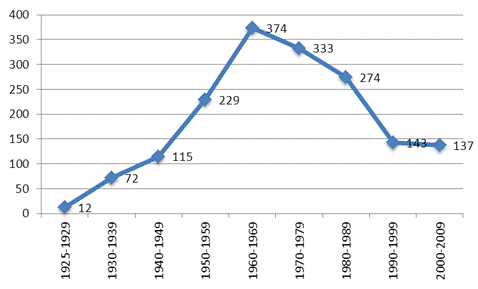 Рассматривая по десятилетиям динамику публикаций в журнале, можно выделить одну «волну» (рис. 4).