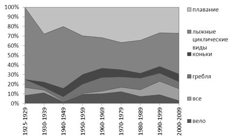 Рис. 5. Относительная динамика публикаций по циклическим видам спорта в журнале «Теория и практика физической культуры» за 1925-2009 гг.