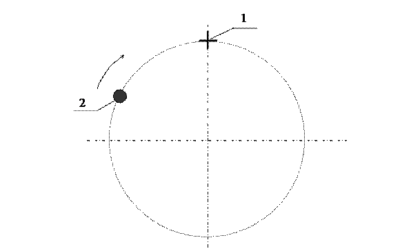 Методика оценки точности двигательных действий. Испытуемым предъявляется на экране видеомонитора окружность, на которой помещена метка 1 и точечный объект 2, движущийся с заданной скоростью по окружности, как показано на рис. 1.