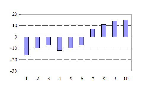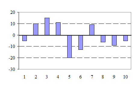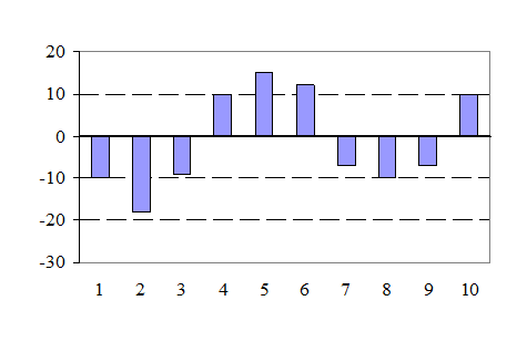 В результате тестирования баскетболиста Е., 18 лет, показавшего лучшие результаты среди баскетболистов, получены следующие значения ошибок не совпадения положений точечного объекта и метки: -5, +10, +15, +11, -20, -13, +9, -6, -9, -5 мс, представленные на рис. 2.