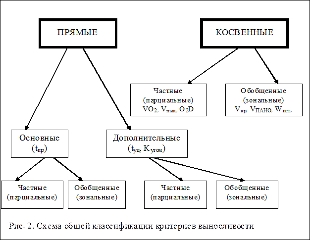 Показатели выносливости могут быть разделены на основные, оцениваемые по предельному времени работы, и дополнительные, которые оцениваются по времени удержания работоспособности и относительной скорости снижения работоспособности под влиянием факторов утомления (константа скорости утомления, коэффициент выносливости). Основные и дополнительные критерии могут быть установлены в отдельно взятых упражнениях, тогда они имеют лишь частное значение, применимое только к этому типу упражнений, или на основе обобщенного анализа выносливости в широком круге упражнений, тогда они приложимы к широкому кругу упражнений (зональные показатели выносливости). Для вывода обобщенных показателей обычно используется установление зависимости показателей общего количества выполняемой работы, общих энергозатрат или общих метаболических сдвигов от показателей предельного времени и относительной мощности выполнения упражнения [1, 2, 4]