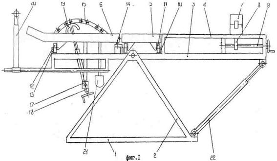 Кронштейн 8 размещен в пазу, выполненном вдоль продольной оси ножной панели, а червячный механизм закреплен на раме в ножном конце. Тазовая секция 5 установлена в поперечных направляющих 10 на подшипниках 11 с возможностью перемещения и снабжена ремнями фиксации (не показано). Грудная секция 6 установлена на подшипниках 12 в дугообразных направляющих 13 и закреплена на раме посредством шарнира 14, размещенного на ее продольной оси симметрии. Рабочая поверхность грудной секции выполнена посредством набора труб, шарнирно связанных между собой, и установлена на осях 16 поворотно относительно ее продольной оси симметрии. В нижней части грудная секция снабжена балансиром 17, на котором закреплен механизм 18 изменения кривизны поверхности грудной секции, выполненный в виде червячной передачи с закрепленным на нем упором 19. В головном конце рамы установлена с возможностью перемещения вдоль продольной оси с последующей фиксацией стойка 20 для рук.